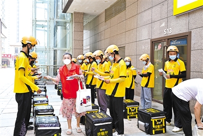 日前,宁波前湾新区团工委联合政法委、湾之福志愿服务队及爱心企业,为外卖员、快递员等送上防暑药品、防疫物资等,感谢他们高温下的坚守。