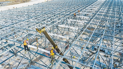 作为前湾新区新能源汽车的排头兵,极氪工厂增加整车产量的同时,在厂区预留地块积极扩建生产线,为后续新车型的生产备足空间。图为新厂房正在进行钢结构架设。