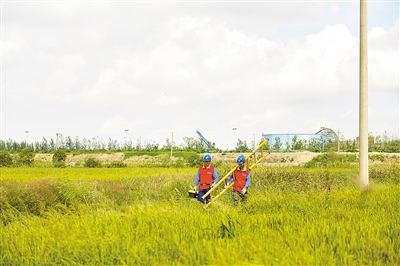 主动服务到田间。日前,国网宁波供电公司杭湾分公司红船党员服务队前往庵东镇东升农场,对农场周边线路、电力设备进行巡视,确保秋收供电平稳有序,助力农户丰产丰收。(记者 黄贲 通讯员 孙洁 摄)
